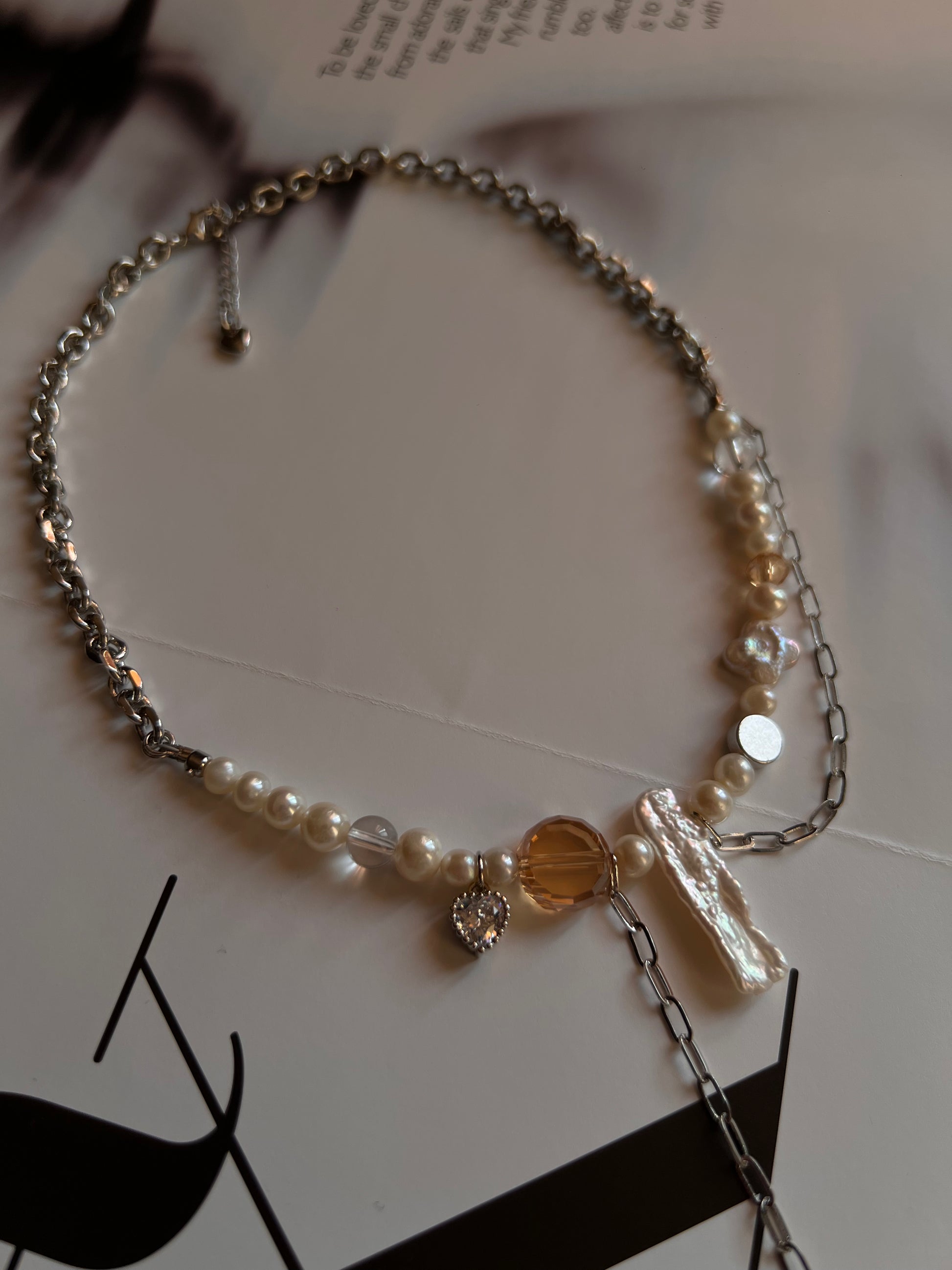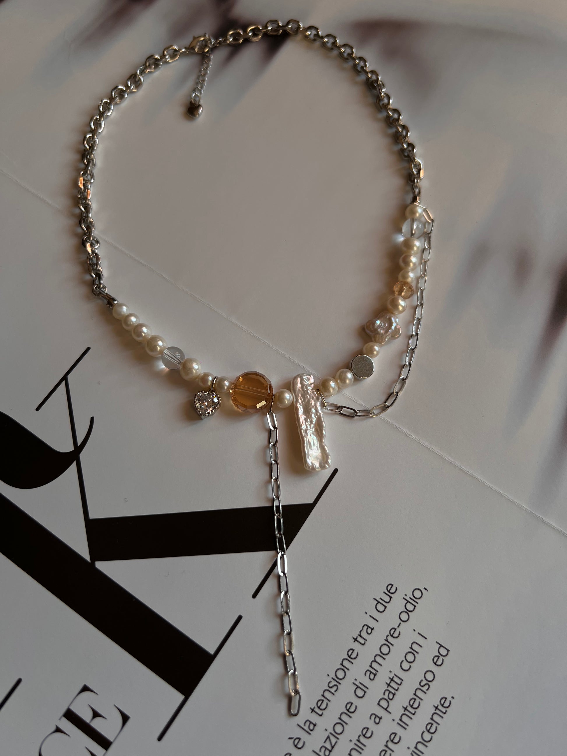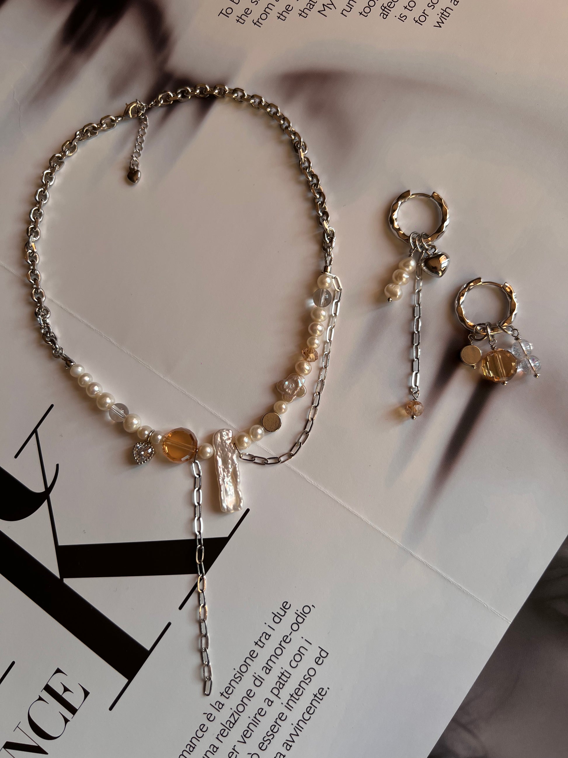 Clear rock crystal, warm brandy-toned crystal, pearls, and silvery links come together in an asymmetrical composition where every facet breathes freedom.