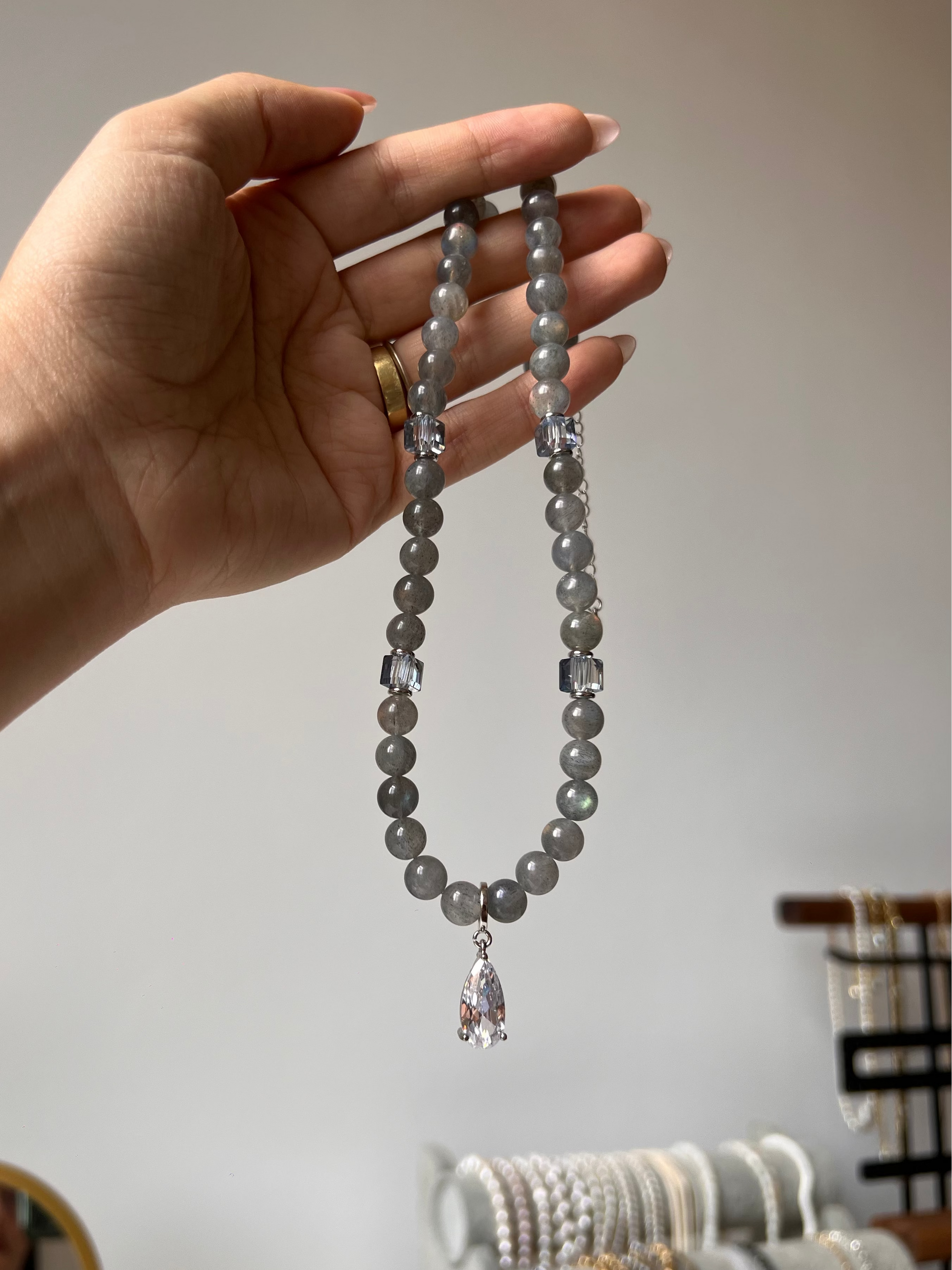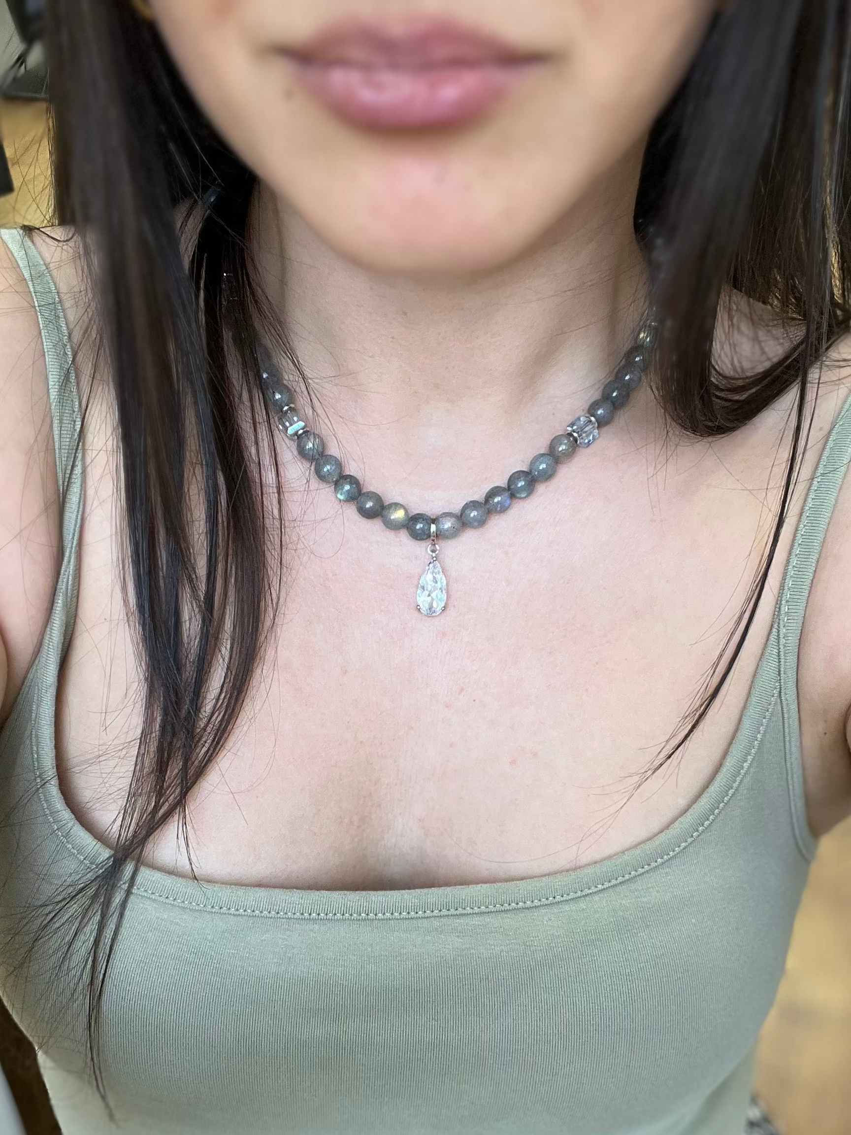 Gray labradorite reveals a thousand shimmering hues — from cool blue to the gentle glow of sunset.