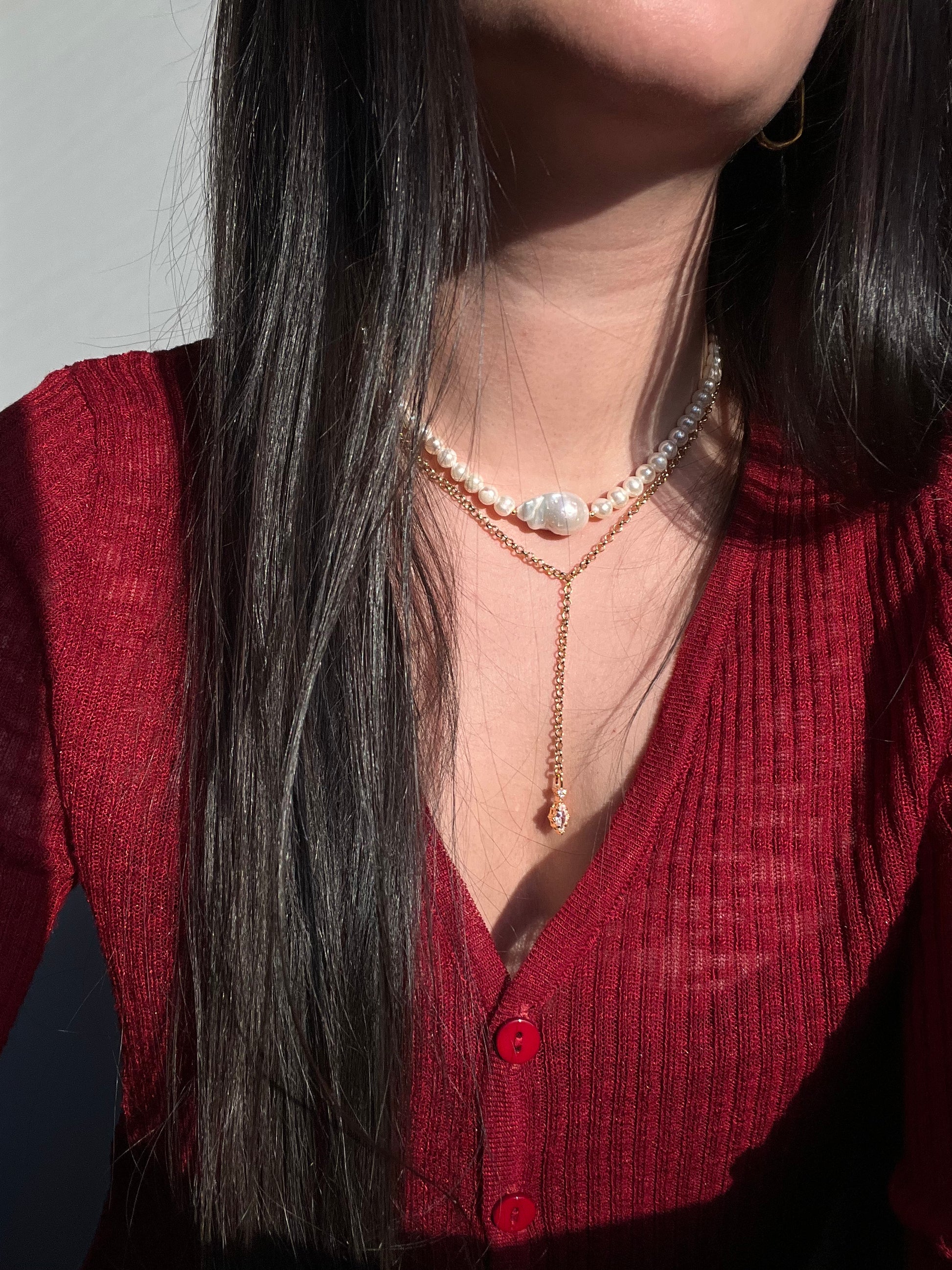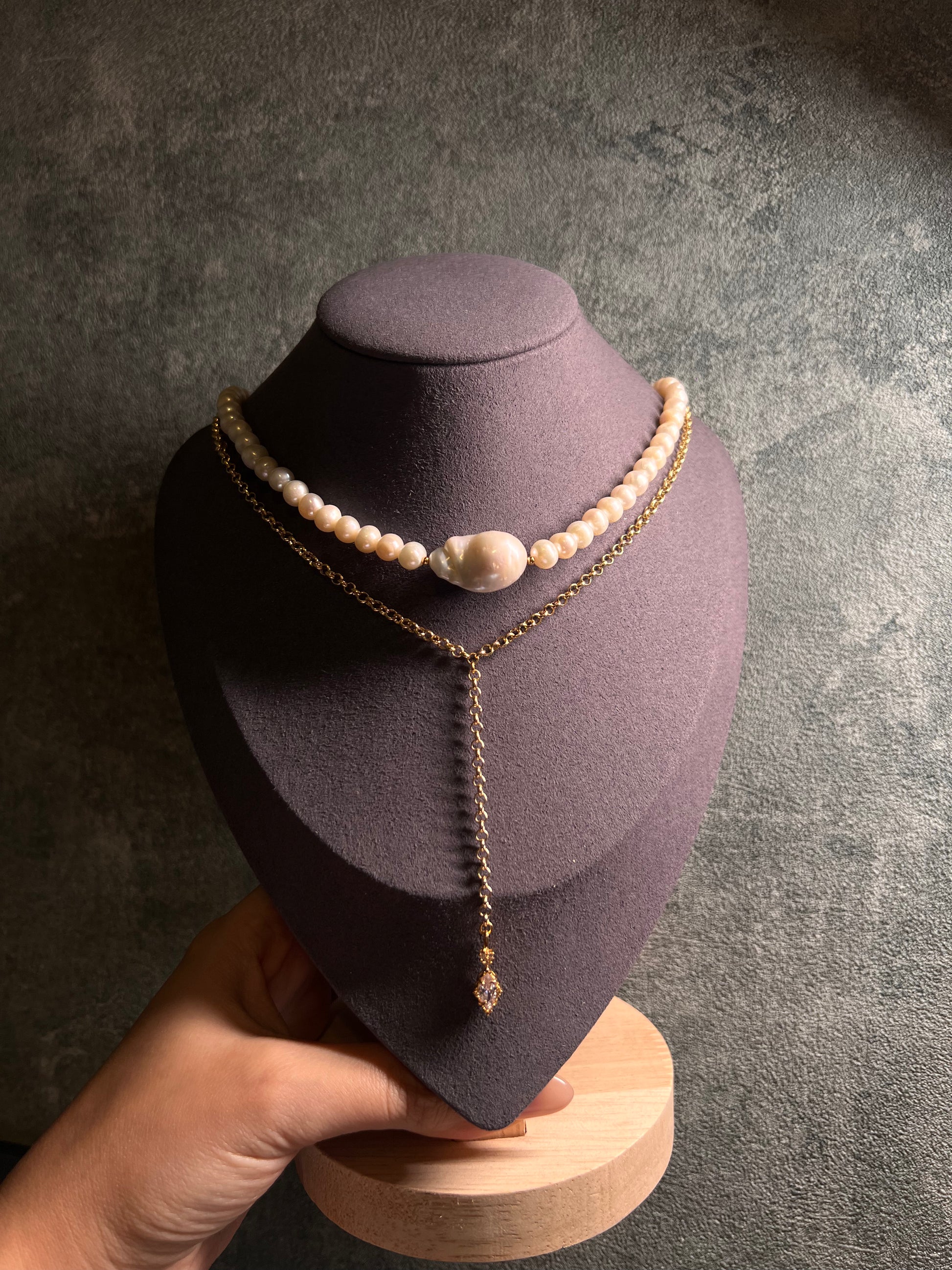 Natural round pearls reflect a gentle radiance, while the large baroque pearl at the center becomes the heart of the composition — alive, unique, and effortlessly beautiful.