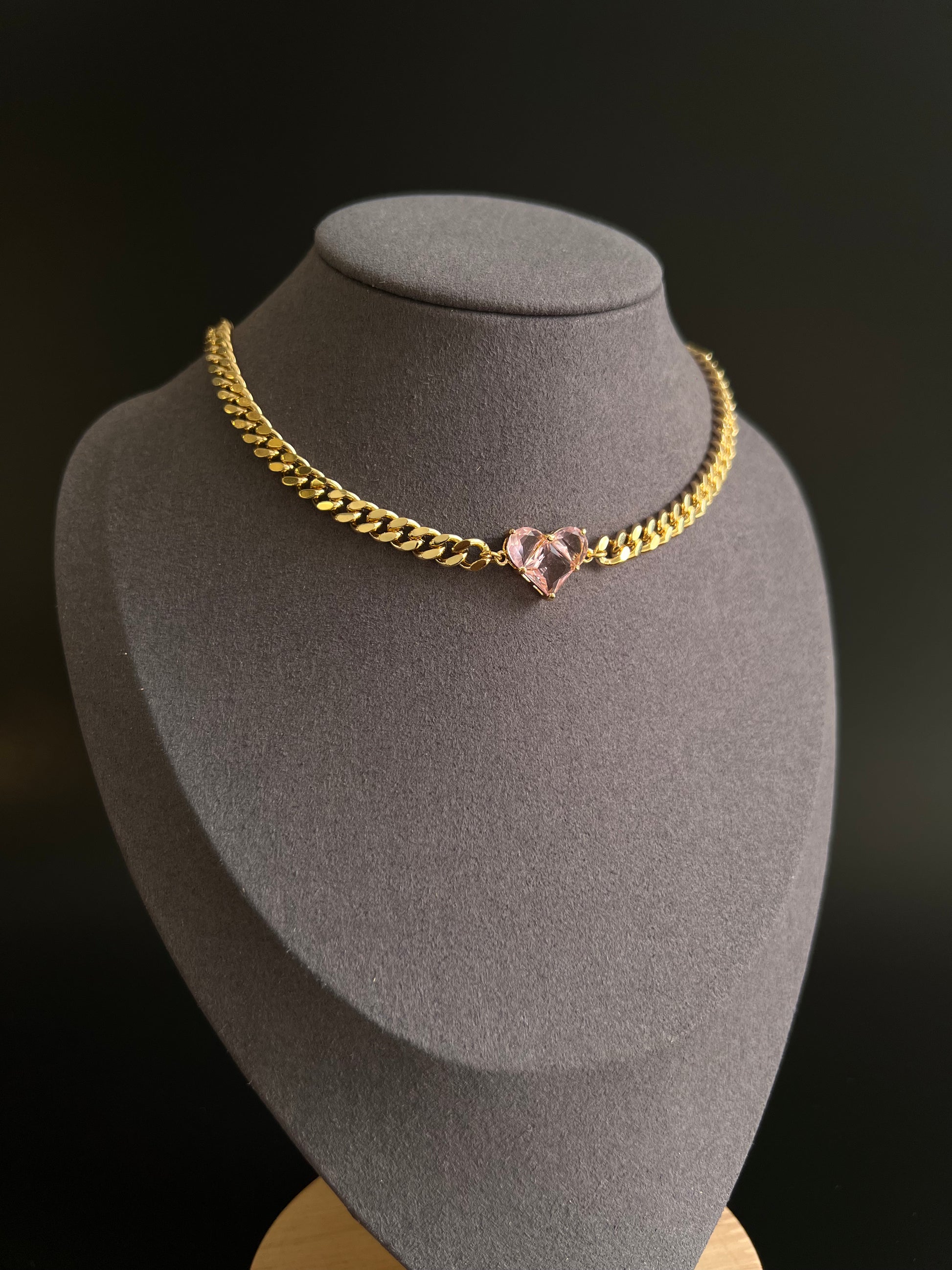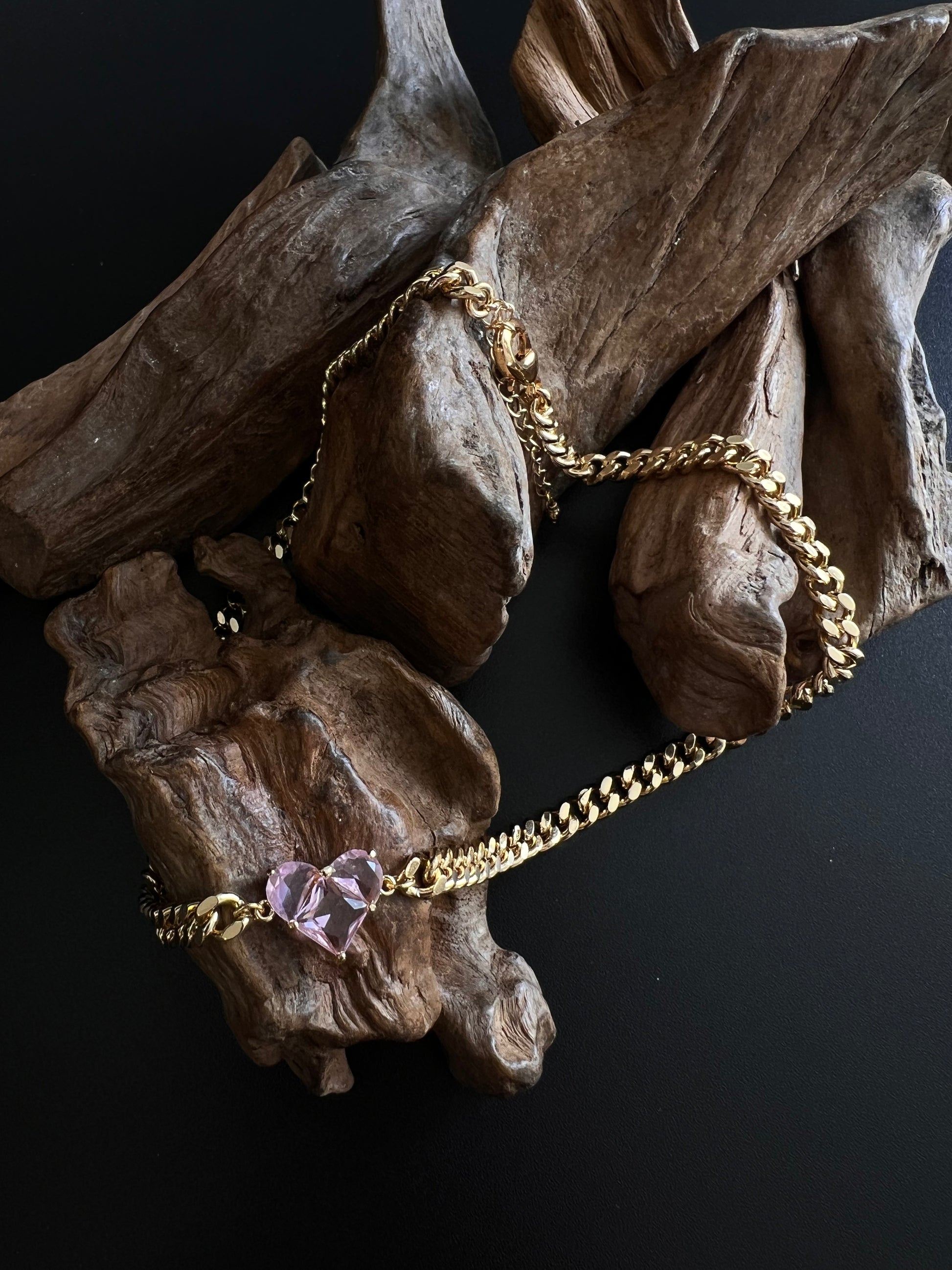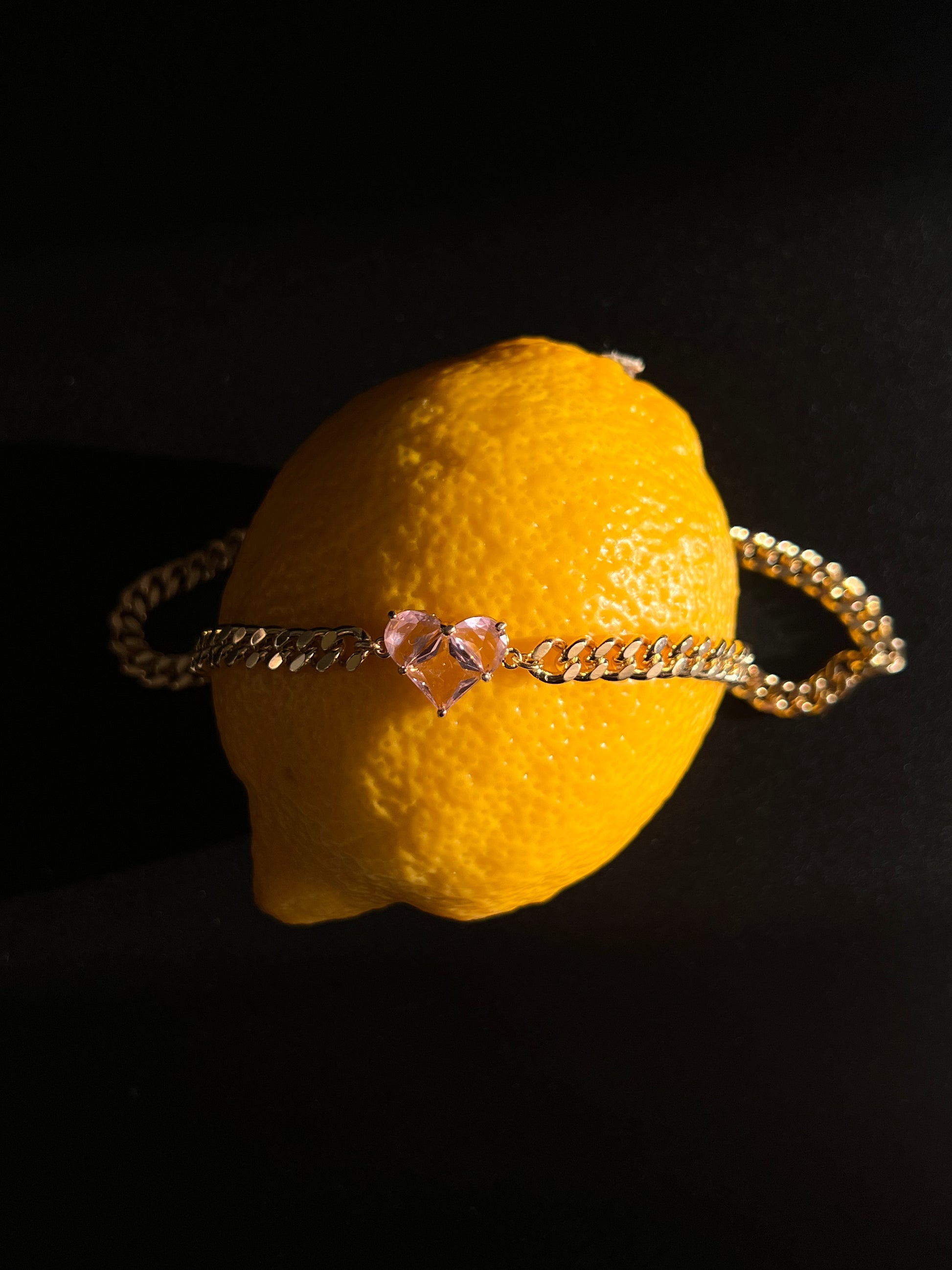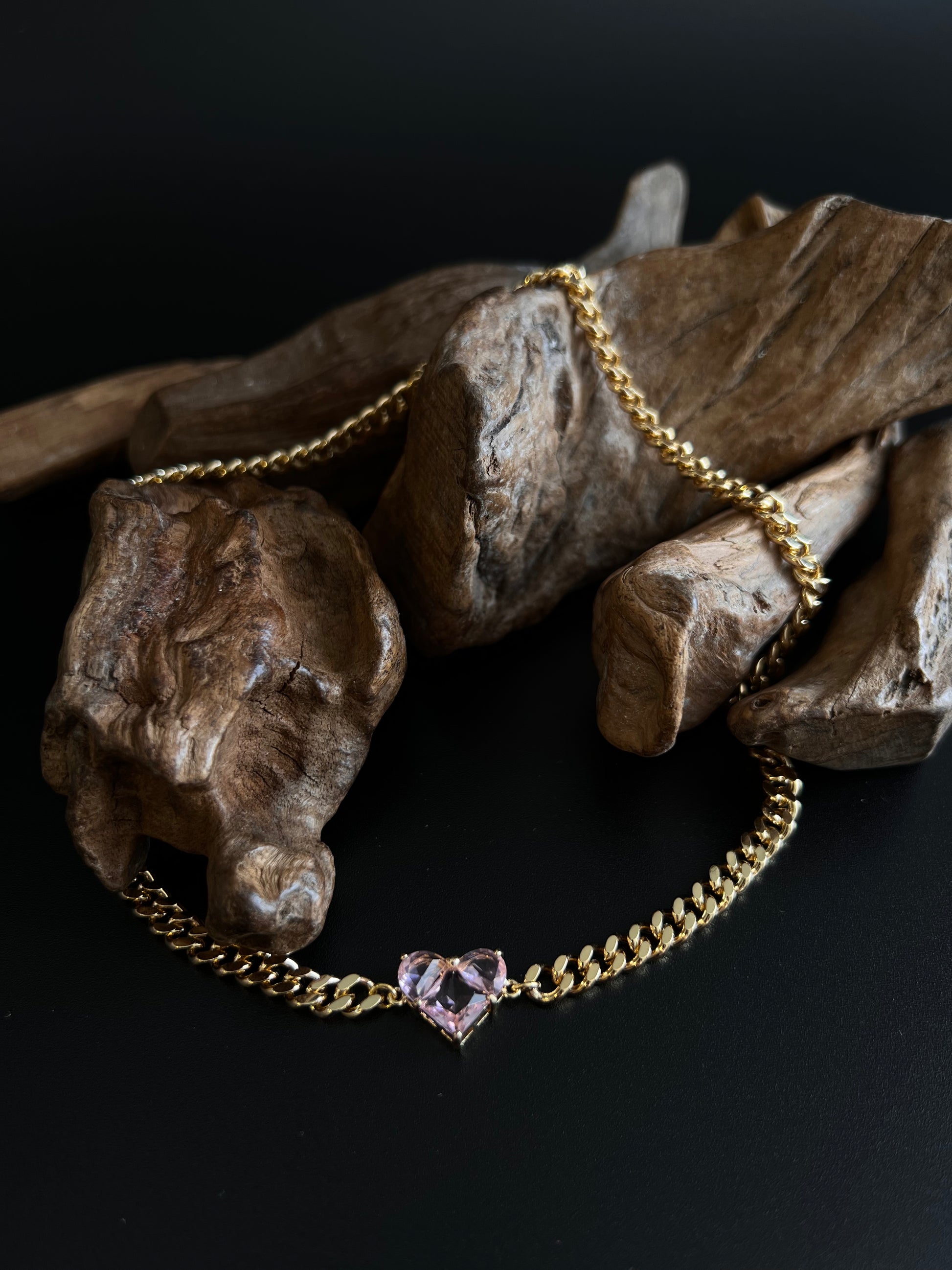 A radiant pink cubic zirconia heart seems to hold a gentle flame within - a reminder of feelings that warm but never burn.