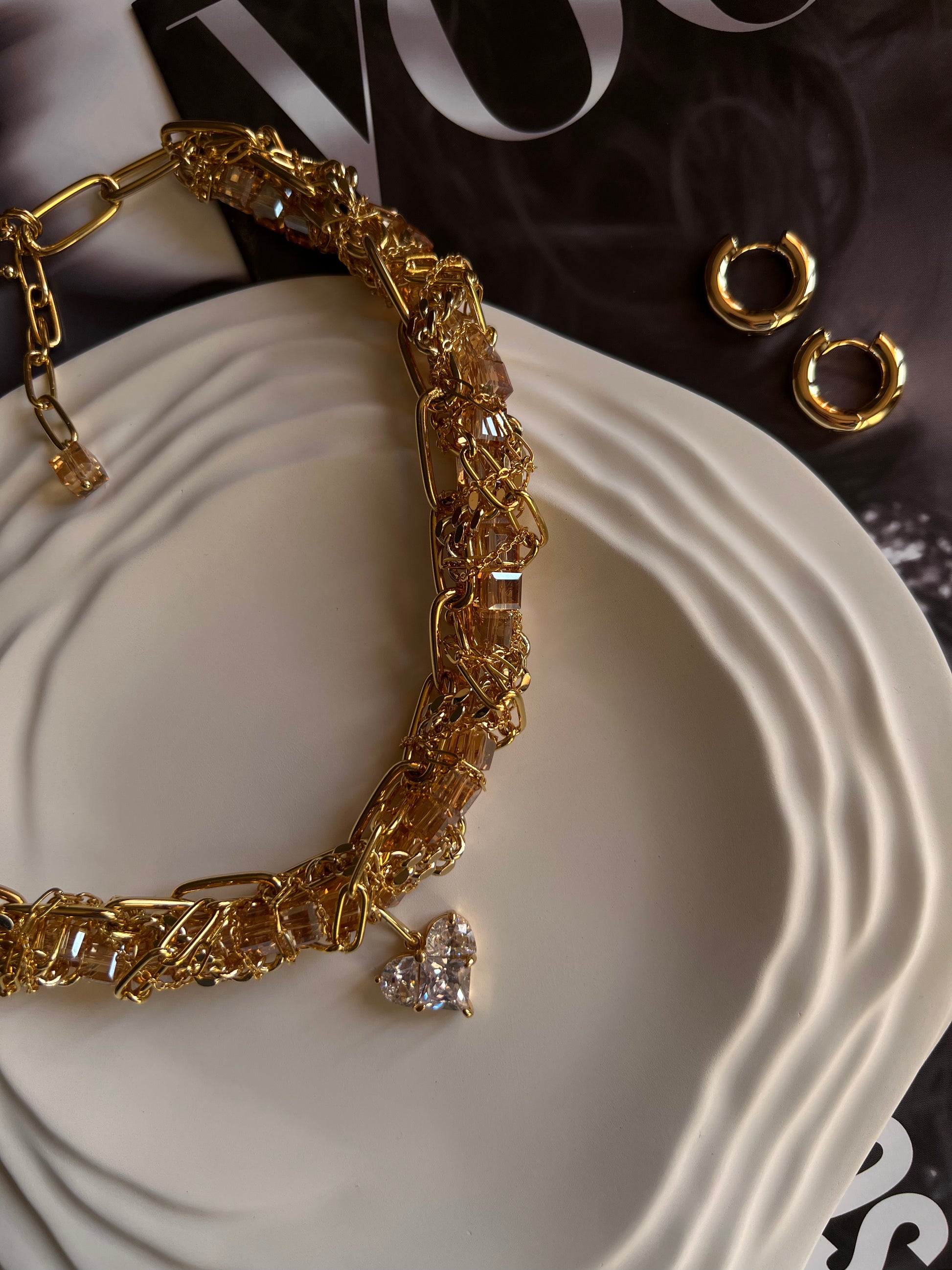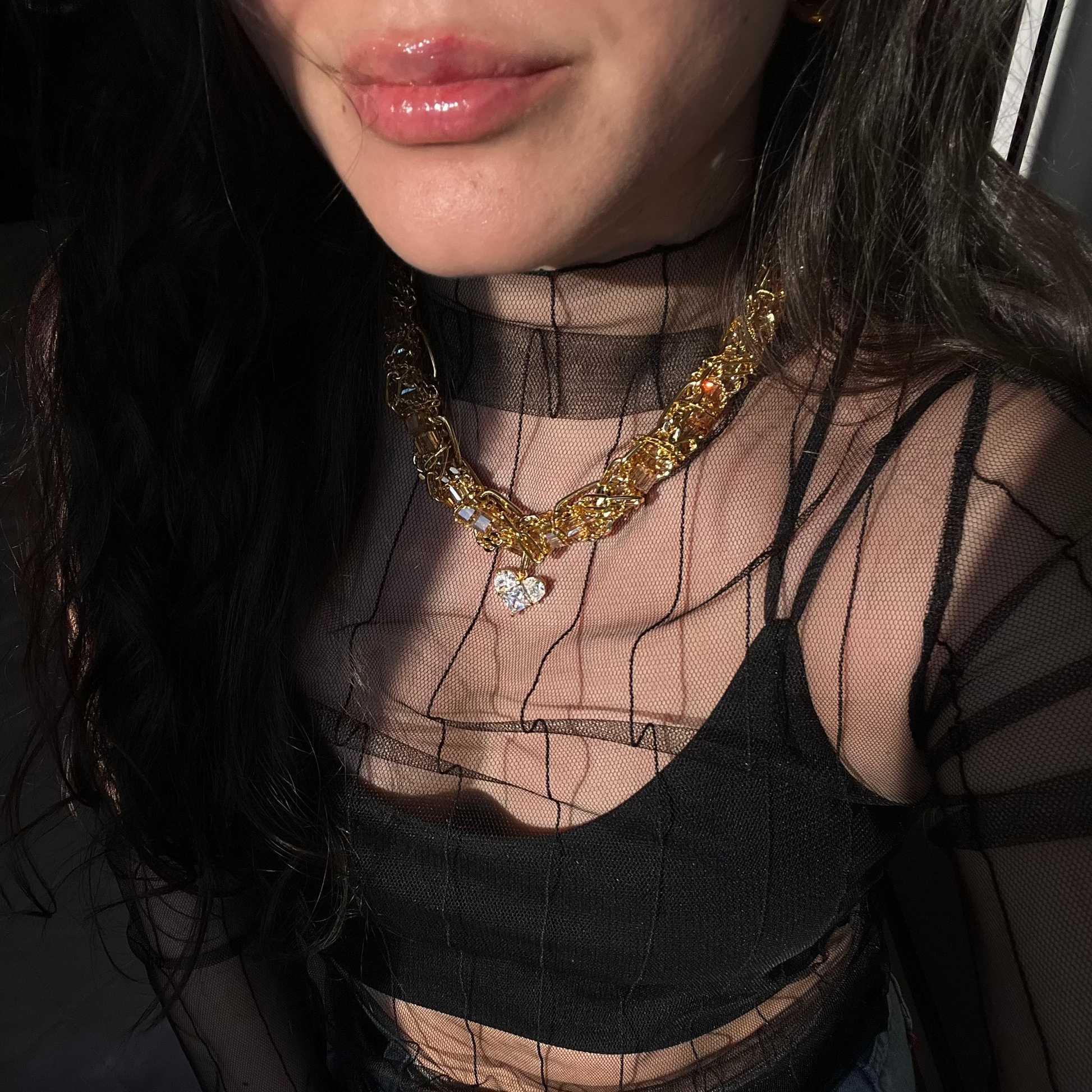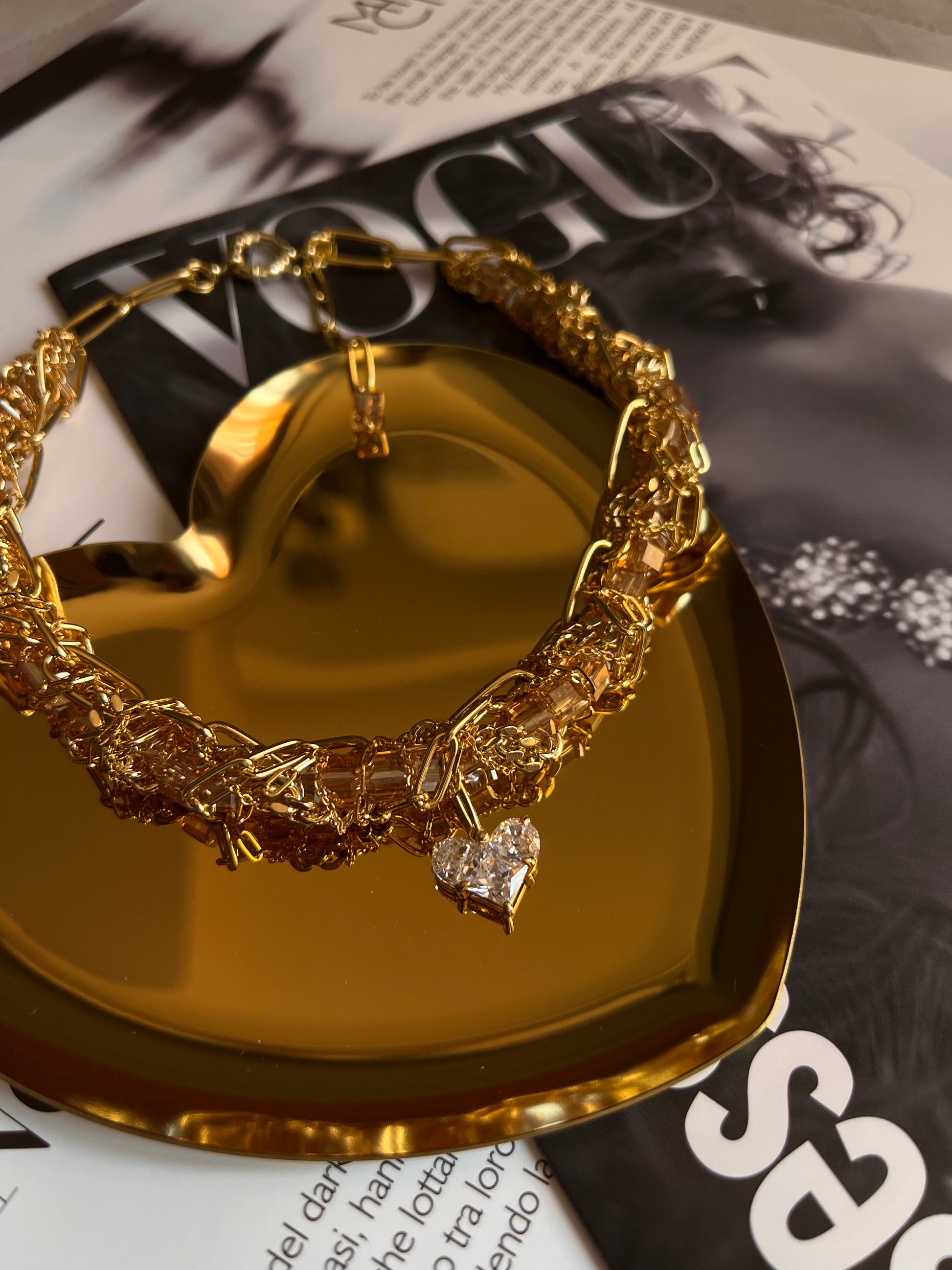 Interwoven chains of varying thickness embrace brandy-colored crystals, creating a play of light and motion. At the center rests a heart, shining as a symbol of strength, love, and desire.